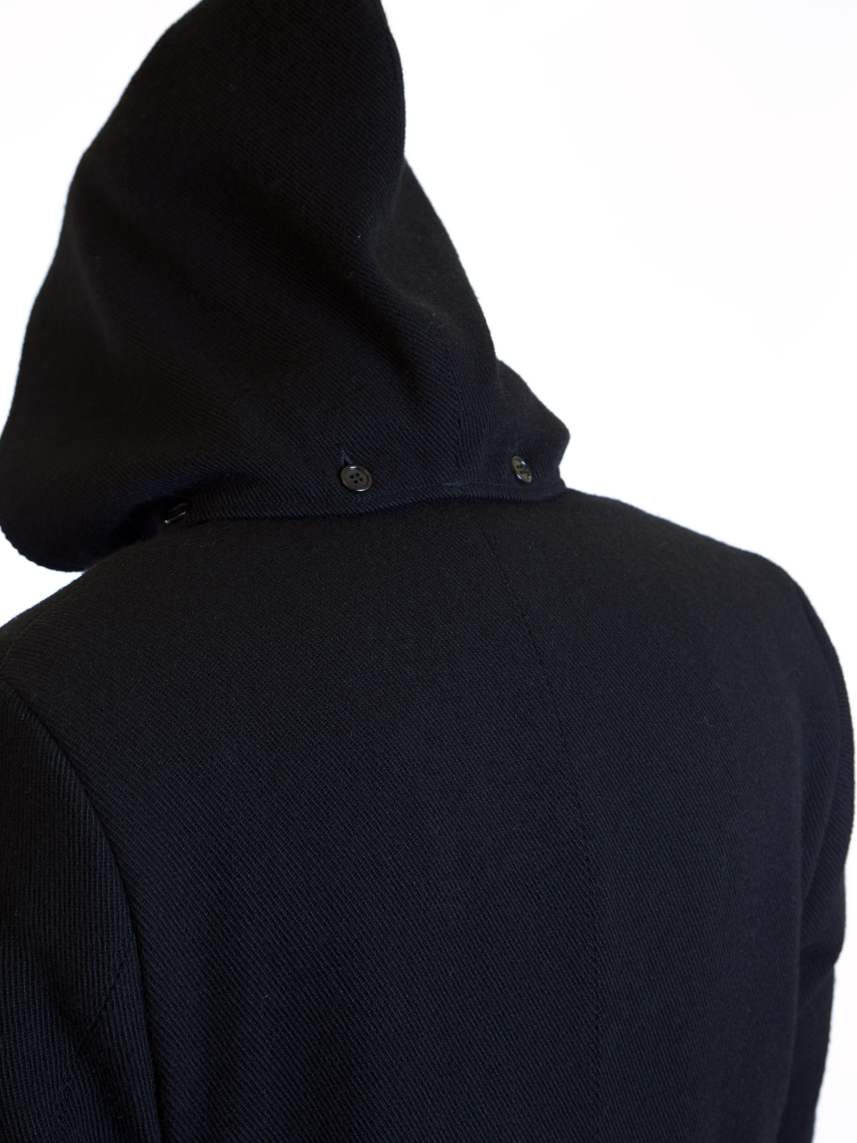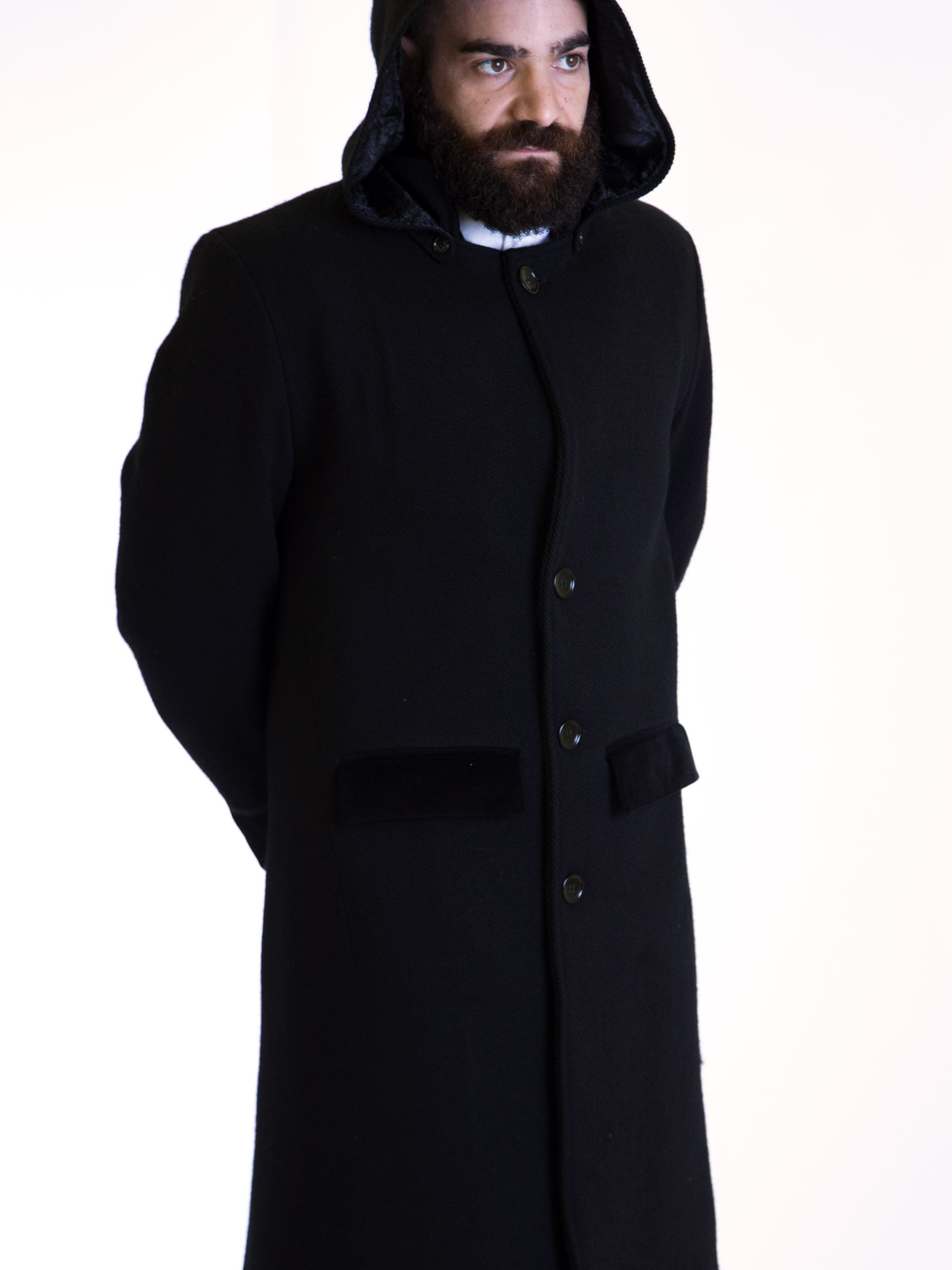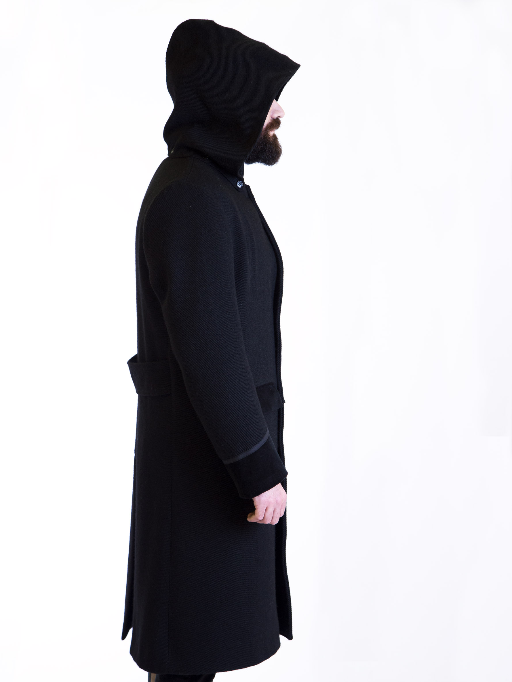 Gabbanu maschile in orbace con dettagli in velluto e martingala posteriore. Il cappotto ha il cappuccio a punta e removibile. Impermeabile.